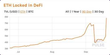 Итак, 2 октября график DefiPulse для объёма общих средств, закопанных заблокированных в DeFi, на продолжительное время превратился в